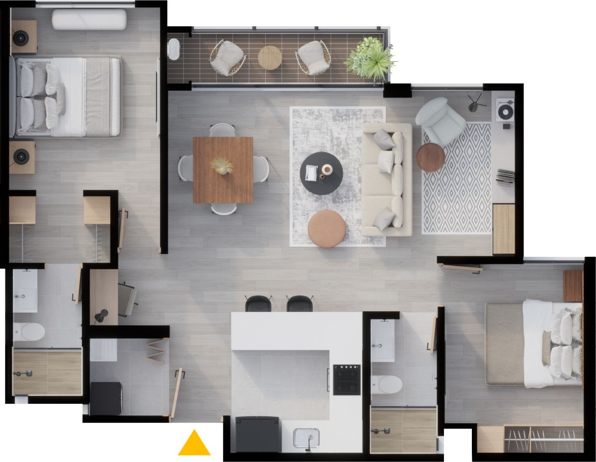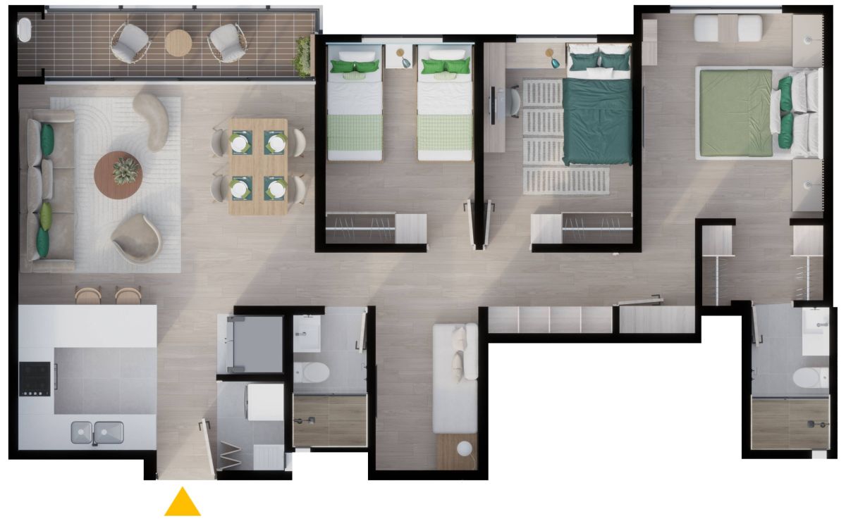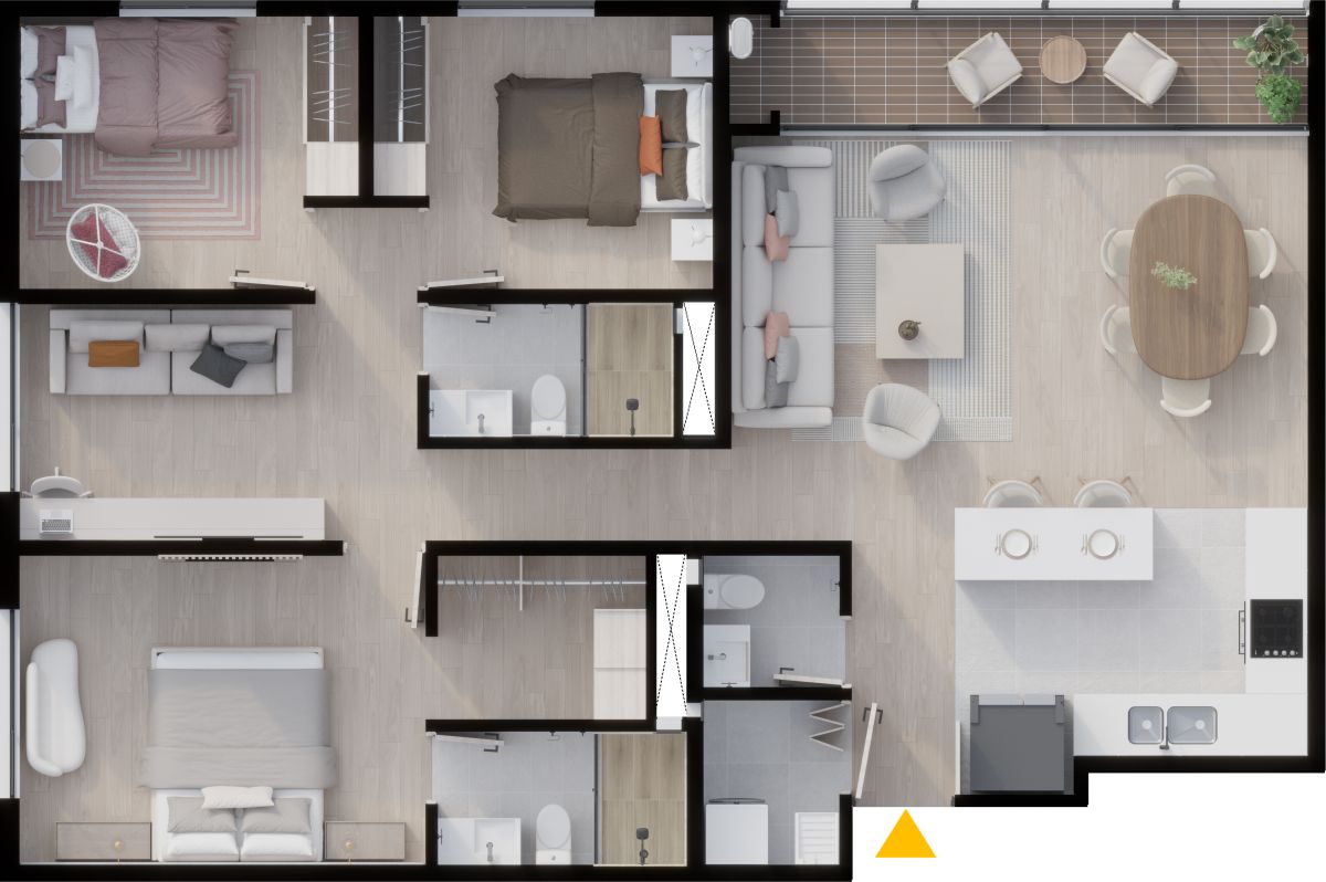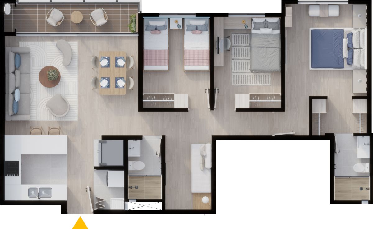 * El precio de venta está establecido en pesos colombianos, está sujeto a la disponibilidad de inventario y puede variar conforme al área, la ubicación y la política comercial vigente. Las áreas indicadas son aproximadas y pueden ser modificadas como consecuencia de ajustes técnicos, procesos constructivos, disposiciones de las autoridades competentes y/o entre otros. Las imágenes publicitarias, planos, renders y demás piezas gráficas constituyen representaciones ilustrativas del diseño y pueden diferir de la percepción y del resultado final de la construcción; por lo tanto, no generan obligación contractual ni constituyen oferta comercial por parte de la Constructora. El mobiliario, electrodomésticos, acabados, elementos decorativos, arborización y demás componentes mostrados en las imágenes del proyecto y los apartamentos modelo, son únicamente ejemplos orientados a ilustrar el uso de los espacios, que pueden diferir de los acabados y especificaciones finales. Para obtener información detallada sobre los precios, áreas, acabados, especificaciones y demás condiciones del Proyecto consulte con la sala de ventas.